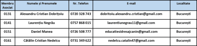 Profesioniștii dresajului canin incluși în această listă sunt în posesia Certificatului de Calificare Profesională emis de Ministerul Muncii și Ministerul Educației și sunt acreditați de către ANICP ca Instructori Canini Profesioniști și Tehnicieni în Modificarea Comportamentului Canin.